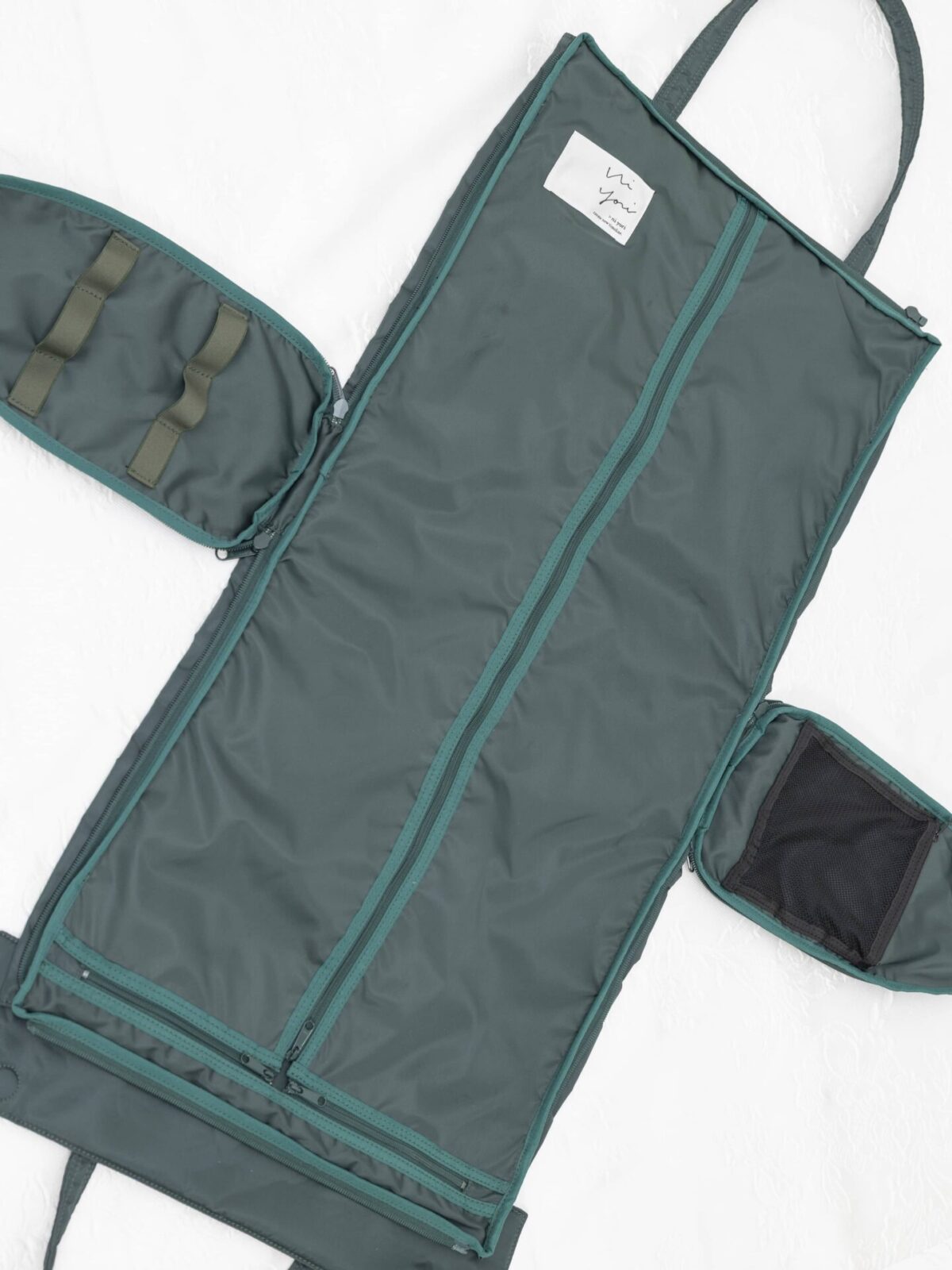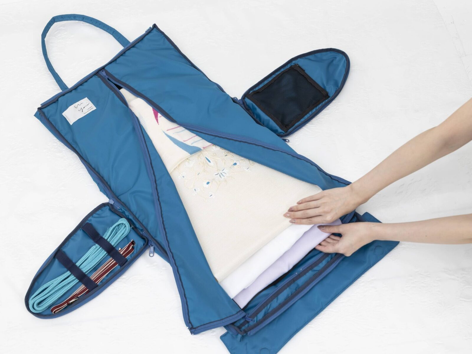 高級な国産撥水生地が大切な衣装を護り、その軽さが旅路を解き放ちます。 フルフラット構造は、装いの美しさを崩さず保ちます。