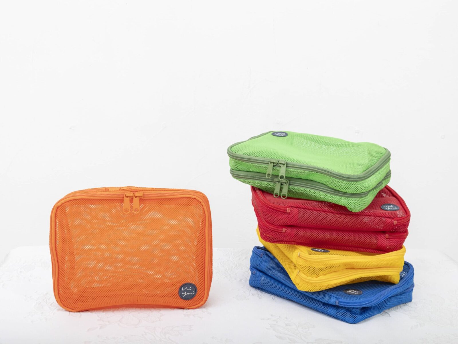 ポーチは赤、青、黄、オレンジ、黄緑の5色からお選びいただけます。
